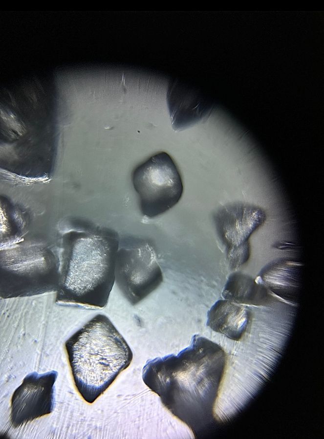 Figure 1: NaCl (99.5%) for lab use ; mounted on a glass slide; 140X magnification plus 2x zoom on phone