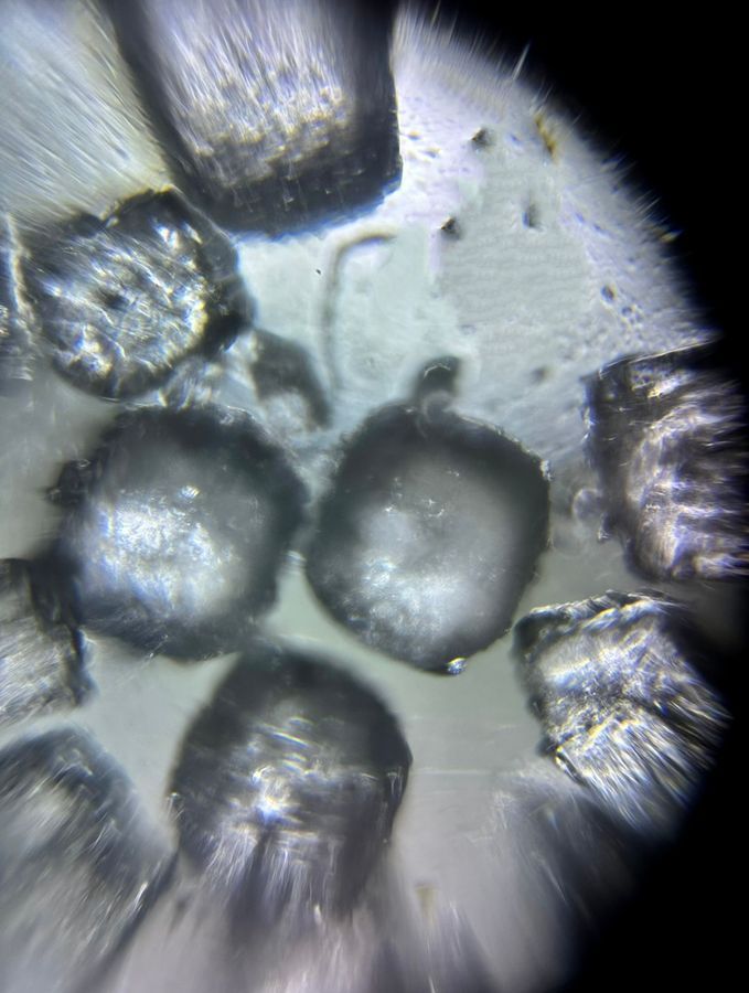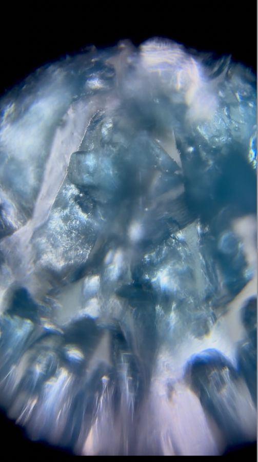 Figure 4: Blue Salt ( CuSO4.5H2O); mounted on a paper slide; 140X magnification plus 3x zoom on iphone Lastly, I wanted to further analyze colored salts and since the color for pink salt was off-white, I wanted to see if we’ll ever see different colored crystals. Hence, I decided to analyze blue salt (or CuSO4.5H2O - copper(II) sulfate pentahydrate). Under the scope, the crystals were distinctly azure blue which would be due to the copper ions present in the formula. Unlike pure sodium chloride, the copper sulfate does not form neat cubic crystal structures. Its shape is irregular and fragmented. As a pentahydrate, it contains water molecules integral to its structure. This disrupts orderly crystallization patterns. Similar to pink salt, it readily absorbs atmospheric moisture, appearing lightly frosted under the lens. It is important to note that this salt is not used for any cooking purposes, and the analysis for blue salt was done under the supervision of a Chemistry Professor at NYU after adhering to strict safety and hazard guidelines. So, please do not try this at home. Another salt that I read about was the Iranian or Persian blue salt ( Cu(C2H3O2)2.) Due to the components, the Government of China has not allowed testing of these components which is why I wasn’t able to secure it and analyze it under the foldscope. Unlike blue salt for laboratory purposes, this iranian blue salt is often used for cooking purposes specifically to add artificial coloring in dishes. Since, I have already analyzed 4 different types of salts based on those I can infer that Iranian blue salt will have similar properties like irregular crystal structures, blue color due to copper ions. It may absorb less moisture and appear clearer under scope than heavily frosted copper sulfate grains. Also, commercial copper sulfate is likely less pure than intentionally food-grade Iranian blue salt, which would show fewer flecks or inconsistencies. However, these are just assumptions about the potential pattern for Iranian Blue Salt without the actual ingredient we cannot definitely analyze its components. In conclusion, one thing common between all salts is that impurities lead to irregular crystal structures. While iodized salt and NaCl for labs have more clearly visible cubic structures (primarily because of the NaCl present) we do not see the same for pink and blue salt which have extremely fragmented crystal structures.