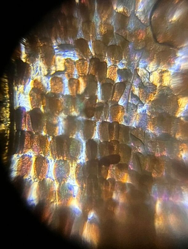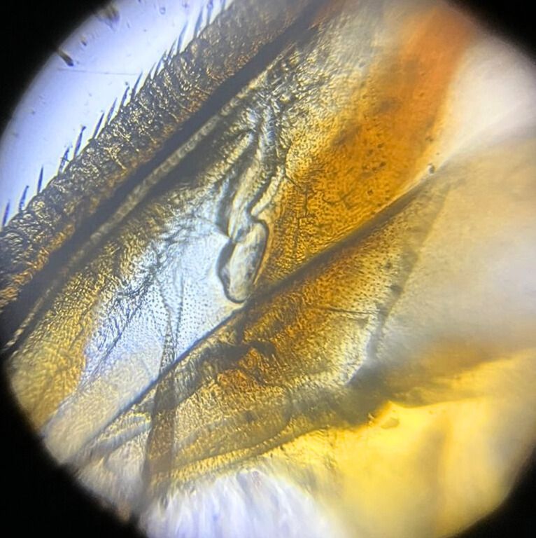 Las alas presentes en la mayoría de los insectos voladores, han proporcionado enormes ventajas para el desplazamiento y la dispersión de estos animales. Para los entomólogos, resulta fascinante el diseño de las alas de insectos, la manera en que éstas se adaptan a la forma corporal y hábitos naturales. Es por ello, que tras años de estudio y análisis, se han clasificado hasta siete formas diferentes de alas para toda la microfauna que forman los insectos. En torno a ello,surge un interés propio para observar bajo el microscopio un par de alas de distintos insectos, un escarabajo y una mariposa, dos organismos muy distintos entre sí a simple vista. En primer lugar, la figura 1 corresponde al segundo par de alas de un pequeño escarabajo.Éstas alas eran delgadas y transparentes. Al centro, tenían un sistema interno de venas muy finas; similar a las hojas de una planta, las alas eran ligeras y frágiles al tacto (Fig.2). La segunda muestra, fueron las alas de mariposa, la cual se puede observar en la figura 3. Éstas alas estaban repletas de pequeñas escamas, de color amarillo-café, en tonos un poco brillantes. Las escamas son las responsables de proporcionarle a las alas de las mariposas su color. En conjunto, estas características de las alas, el color, la forma, textura, incluso tamaño, permiten clasificarlas, en este caso, se observaron 2 tipos de alas: membranosa (escarabajo) y escamosa (mariposa).