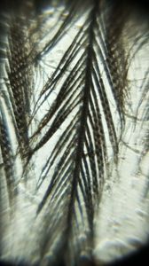 Well, today, using my Foldscope, I looked really closely at these feathers. You know the ones that cover a pigeon's body? They're called contour feathers, and I was especially interested in those long ones at the tail, called retrices.