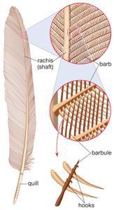 Now, let me tell you what I found. Picture a feather like a tiny tree branch. It has a main part called the rachis, which tapers down like a tree trunk. On each side of this trunk, there are branches called barbs. These branches are pretty special because they have even tinier branches called barbules. At the end of these tiny branches are little hooks called hamuli.