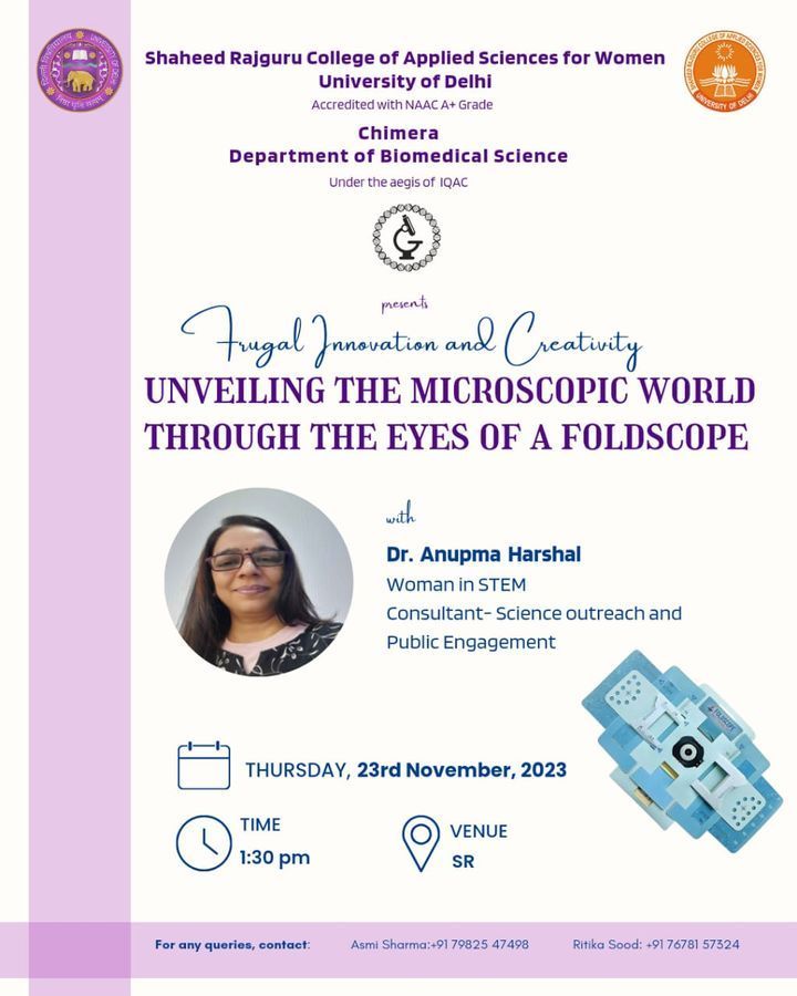 Venue -Shaheed Rajguru College of Applied Sciences for Women AMR is a global health concern wherein microorganisms, such as bacteria, develop resistance to the drugs (antibiotics) that are used to treat infections. Foldscope can be used as an educational tool to increase awareness about microbiology and the role of microorganisms in health, disease, and AMR. It can help people understand the microscopic world, including the bacteria that can cause infections and how they might develop resistance. The tool was used to explore the world of cells helping in students know the foe #knowurfoe.