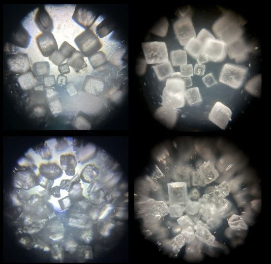 Figure 4. Salt (top) and sugar (bottom) crystals viewed under a Foldscope 2.0 at 50X magnification using brightfield (left) and reflective (right) lighting techniques (Photo Credit: Holly A. Stuart)