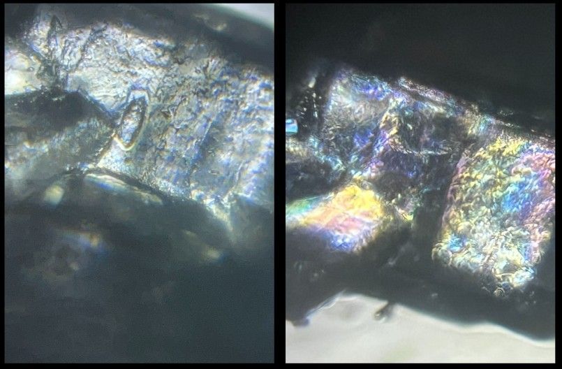 Figure 5. Sugar crystals viewed with brightfield (left) and polarized (right) light under a Foldscope 2.0 at 140X magnification plus 5X digital zoom on phone (Photo Credit: Holly A. Stuart)