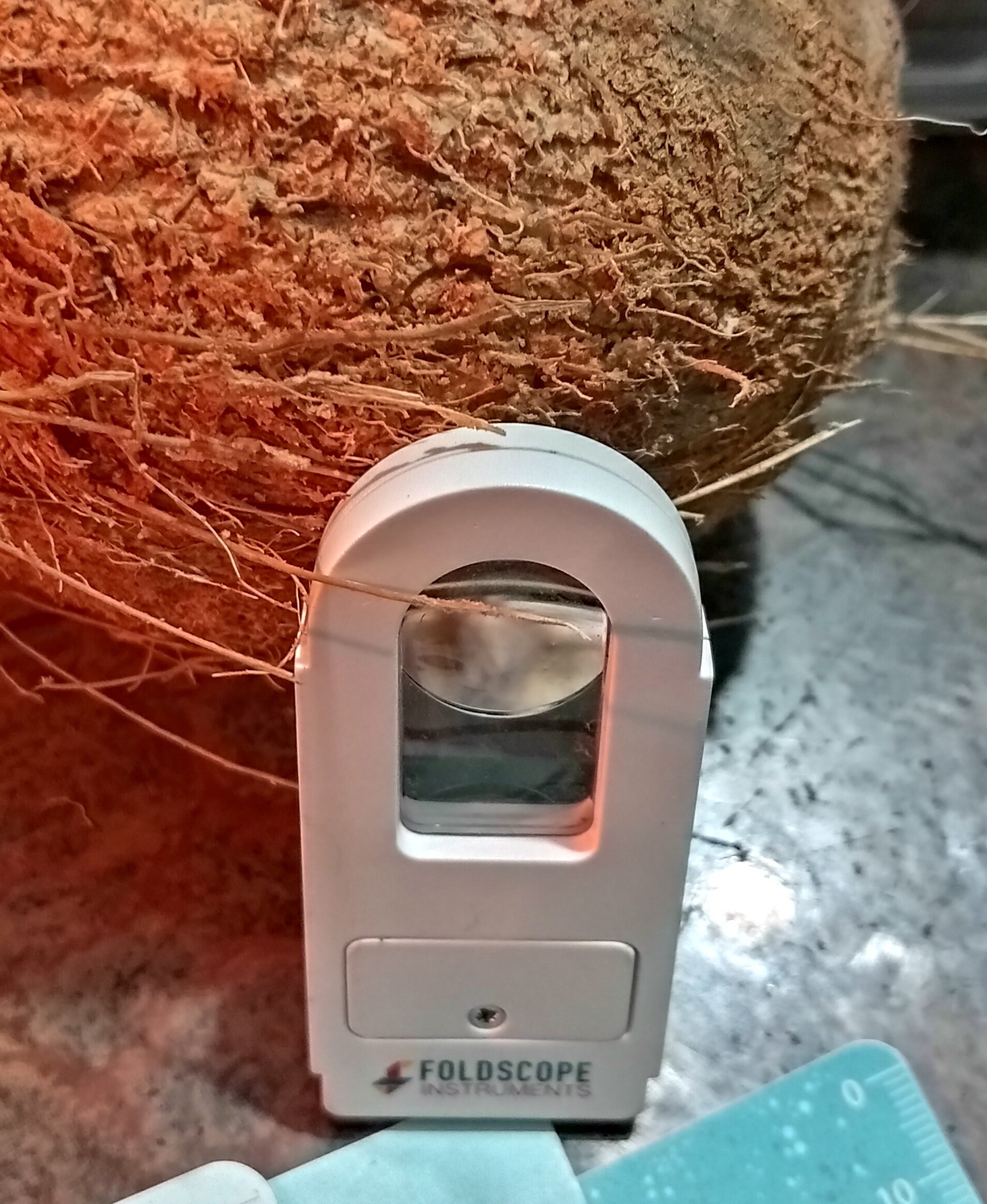 For this analysis, I picked a single coconut shell skin and observed it under the foldscope, which is quite interesting in observing the patterns.