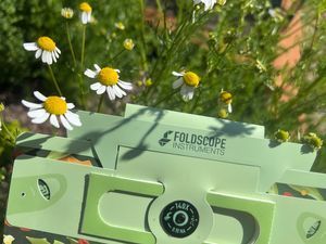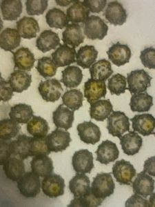 The flowers themselves are very small and delicate looking. The pollen from chamomile is so small that I had to use 340X magnification plus 5X digital zoom on my phone to really see details on the individual grains. I couldn't get a good image with reflective lighting for this sample, but I did use brightfield, darkfield, and a lightbox. You can see that the surface is covered with spikey/spiney structures. I guess the better to stick to the hairy legs of the bees that come to visit!