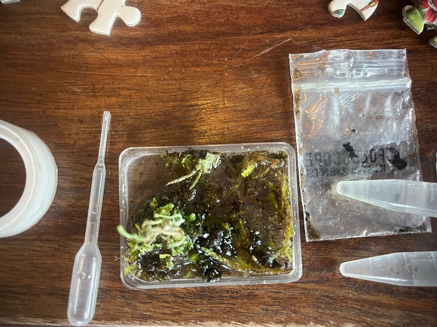 At one of our stops (the Bridge of Orchy Hotel), I went out to the river and gathered a bit of moss, lichen, and river water and proceeded to begin the tardigrade hunt!