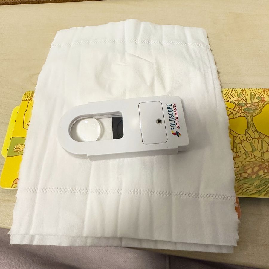 However, as soon as I tried to take a picture of my first sample, my camera lens was overwhelmed by the brightness of the foldscope light, even on its lowest setting, so I got creative and put three napkins between the flashlight and the foldscope to minimize the brightness.