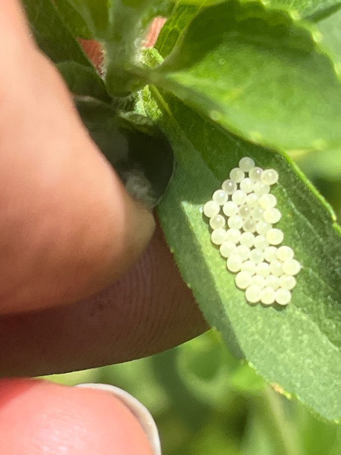 I found a group of eggs on a stevia leaf. They were all white with some looking like they might have a grayish tint to them. One interesting thing I noticed was that they were on the top of the leaf. Normally when I find insect eggs, they are on the bottom side of the leaf to avoid detection.