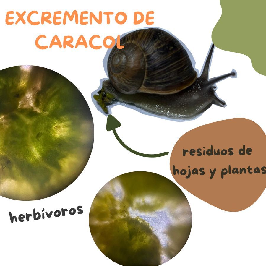 Los caracoles se alimentan de la vegetación a su alrededor, producen material vegetal parcialmente digerido, también son productores de mucoproteínas y celulosa las cuales se encuentran en sus heces y al desplazarse. A través de estas partículas los distintos agregados del suelo se unen y forman agregados más fuertes. Por su parte, forman parte de la materia orgánica del suelo, son ricas en calcio, magnesio, potasio, fósforo entre otros . En la figura , se observa una muestra de heces de caracol, con trozos parcialmente digeridos de algunas hojas.