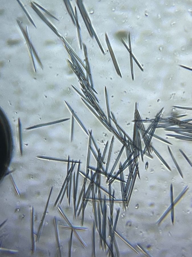 Calcium oxalate crystals in pineapple juice viewed with increasing levels of magnification (50X - left, 140X - middle, and 340X - right)