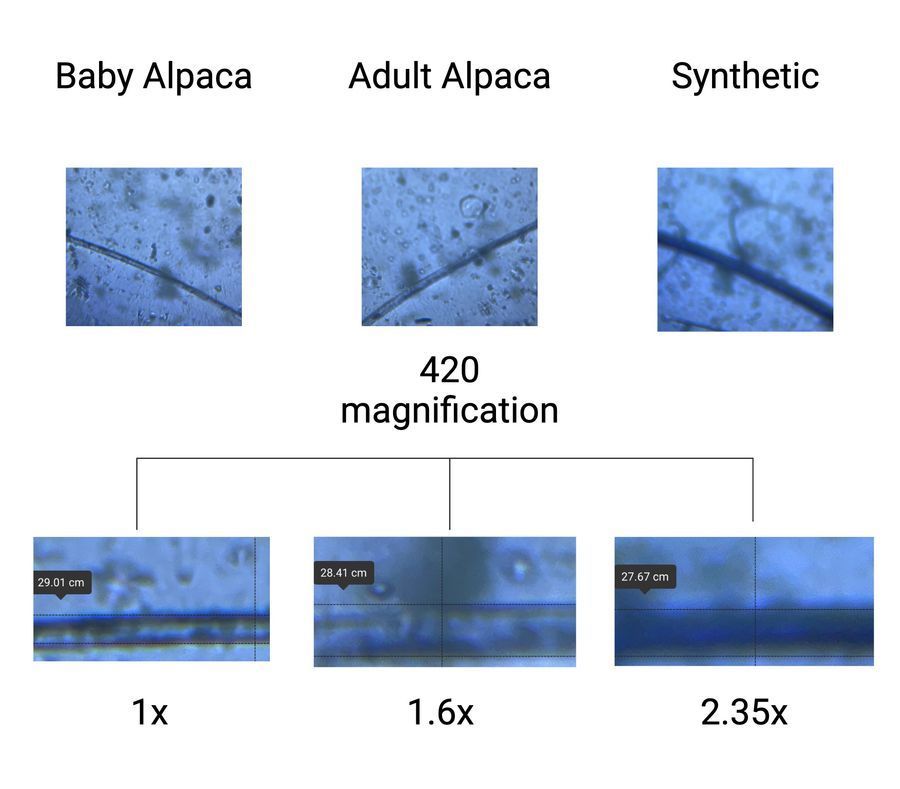 I wanted to explore some indigenous wisdom I had heard. Quechua textile women told me that just by feeling the fibers they can tell whether something is baby alpaca, adult alpaca, or synthetic. They say baby alpaca is really fine and adult is more course and synthetic is really course. So I thought, what if I can see this with the microscope? So I took pictures of a strand of each fiber and analyzed the photos. I compared the thickness and saw what the Quechua women can just feel with a touch of the fiber.