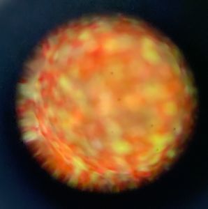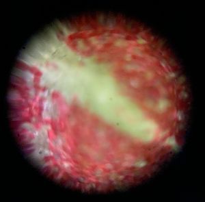 I took the leaf off the ground and decided to bring it to my ecology class. Today, we were building Foldscopes, and so I figured that this could be an interesting organism to look at through this origami microscope. I ripped a small piece off and placed it on one of my slides. When I put my camera in front of the lens and lifted it towards the light on my classroom ceiling, I was exposed to a red circle with green spots all over. Moving the slide around, I also found some streaks of green among those spots. These images weren't originally visible when I was looking at the leaf earlier in my friend's dorm room. But when using the Foldscope, I could see that there's so much more to this leaf once you zoom in and take a closer look. It's really not as simple as it may seem.