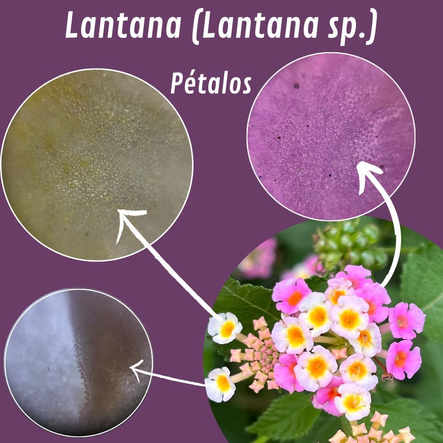 Durante el mes de abril en Xalapa, muchas de las plantas se encuentran en floración, y me tocó aprovechar algunas flores para mis observaciones. Comenzamos con el género Lantana , este tiene alrededor de 130 especies, en su mayoría americanas y pertenece a la familia Verbenaceae. Es un arbusto que no suele sobrepasar los 2 metros de altura. Tiene hojas opuestas, ovales, dentadas y ásperas. Las inflorescencias se desarrollan en corimbos . Existen variedades según el color de sus flores (rojas, amarillas, rojas y amarillas simultáneamente, moradas, azules, etc). Es una planta ornamental, que se utiliza para atraer polinizadores; a excepción de algunas especies que también tienen usos medicinales, por ejemplo Lantana camaraL. Conociendo un poco más de este género y aprovechando su floración, decidí observar algunos pétalos de un arbusto que está en un parque. En la figura 1 se observa una muestra de pétalo de Lantana , los saquitos o burbujas que tienen los pétalos son cromoplastos, y estos son los encargados de dotar de color a las flores y frutos. A su vez, la textura del pétalo se hizo visible, permitiendo observar pequeños dientes sobre la superficie de este.