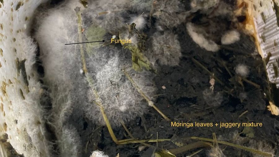 My sister wanted to make an organic manure with Moringa leaves and jaggery for her garden plants. She mixed equal parts of Moringa leaves and jaggery and allowed it to ferment. She had to stir the mixture once a day for two or three days but she forgot to stir. On the third day we noticed fungus on the mixture. I observed the fungus under the foldscope and took photos of the sample.