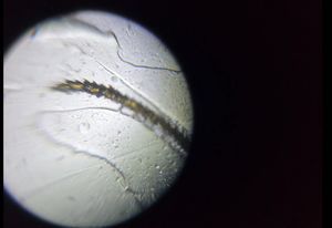 Se observo una parte de los restos de una polilla con ayuda del Foldscope, se utilizo un portaobjetos y se coloco cinta en ambos lados para poder fijar la muestra, utilizando una camara de una celular con un aumento de solo x1 se obtuvieron los siguientes resultados.