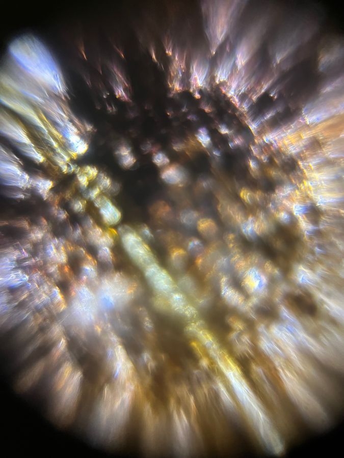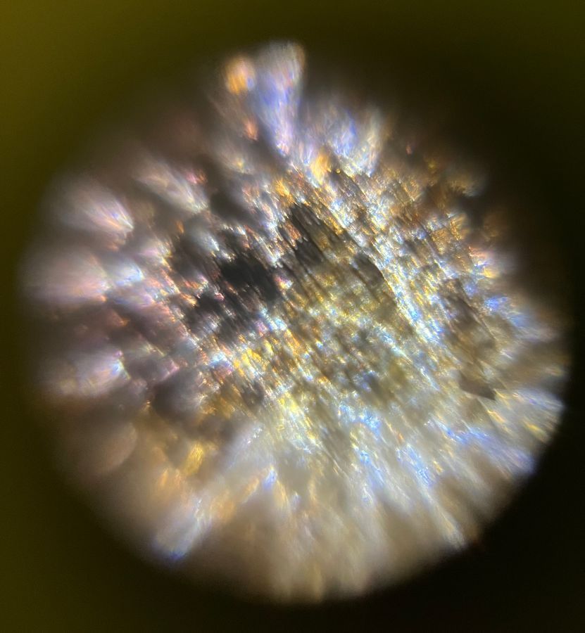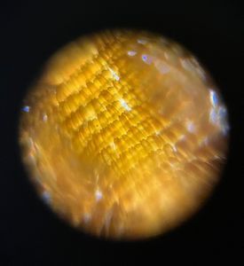This image depicts a sample of a common buckeye butterfly's wing from a sample taken in-lab. Below is an additional image that shows the scope of refracted color and iridescence from reflected light from the same sample.