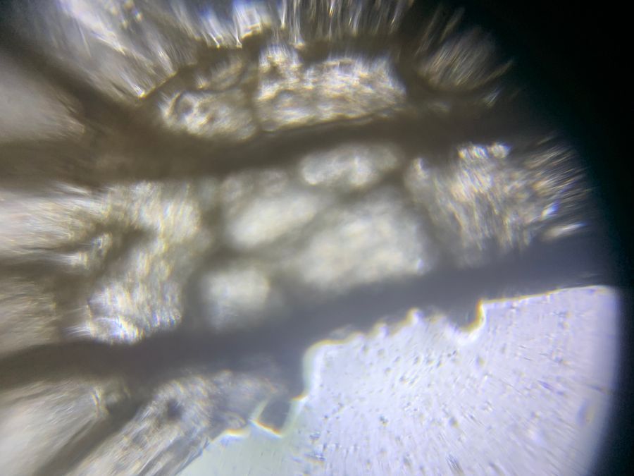 After assembling the foldcope and then finding a sample, it was a cool experience to observe the detail of the dry leaf. Especially because it was rather hard work to put the foldscope together and that made the experience even more rewarding. Looking through the lens and a special light, I got to see the details that were not possible to see with a bare eye. From the outside it looks like a plain, dry textured exterior, however, under the closer inspection you can see the leaf veins that once would supply the tree with life through its network of complex photosynthesis processes.