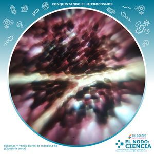 Hace unos días encontré una mariposa muerta de la especie Diaethria anna y la conservé para observar sus alas en el Foldscope. En México y otros lugares de latinoamerica se le conoce comunmente como mariposa 88 debido al patrón de colores en forma de número 88 que se forma en sus alas. Sin importar si son diurnas o nocturnas el color de las alas de las mariposas es innegablemente cautivante. A simple vista pareciera que tienen una especie de polvo de colores sobre las alas, pero la verdad es que se trata de nada más y nada menos que de ¡miles de diminutas escamas! Las escamas además de revestir de color a las alas les sirven a las mariposas para almacenar calor, defenderse de los depredadores por medio del camuflaje , para impermeabilizar su cuerpo y protegerlo del frio o el calor y para que se reconozcan entre ellas. En algunas especies de mariposas los machos tienen glándulas que segregan sustancias químicas llamadas feromonas, las cuales utilizan para atraer a las hembras de su misma especie para aparearse.