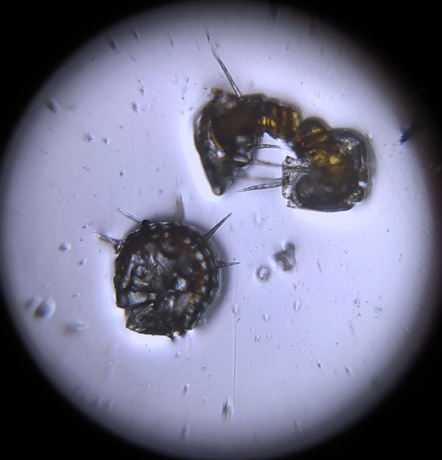 Figura 2.- Izquierda-abajo: Esporangio de helecho con filamentos en la superficie. Arriba-derecha: Esporangio eclosionado y con anillo.