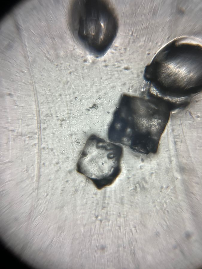 This is a picture taken from my phone of a sample of salt. It was just last week when my biology teacher was taking about microscopy, this is when we learnt about microscopes and also is when he gave us the fold scopes. This was a very easy to use instrument and this is the first ever slide I made and it was just regular table salt. It was interesting learning about microscopes and I really liked the idea of a non expensive, portable, durable pocket sized microscope.