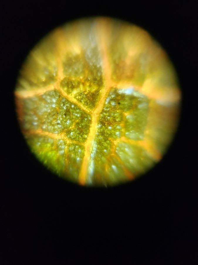 The leaf turned out to be really pretty upon magnified inspection, thanks to its chlorophyll-iness. I also didn't expect it to be so bright and translucent under a foldscope. The way the yellow veins extended out like a hydra was really cool to me, creating a pattern of partitioned, green, sparkly polygons all over the leaf. I decided to check out the blade of grass next.