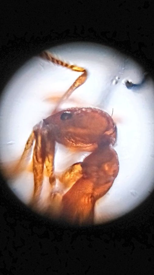 observed a red ant under my Foldscope! 🐜🔬 Its tiny face, complete with eyes, was fascinating to see. What made it even more interesting was that the ant was already deceased, having been captured by a spider. Nature never ceases to amaze me! #MicroscopicWonders
