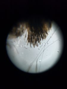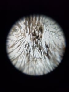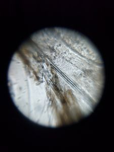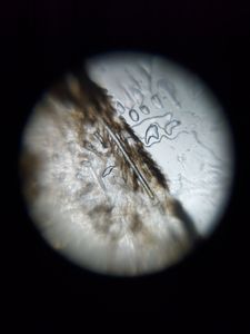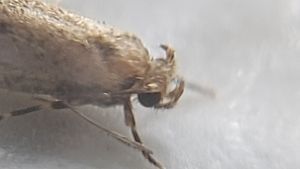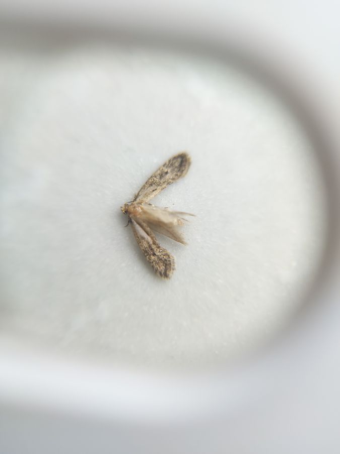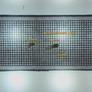 Bitácora Foldscope. El día de ayer descubrí esta pequeña "palomilla" en mi cocina mientras barría. Fui por una lámpara para verla mejor y con ayuda de la lupa Foldscope pude notar varias características de su cuerpo. Cuando dije que era pequeña, realmente lo decía en serio. Medía apenas unos cuantos milímetros. Accidentalmente la decapité cuando quise ponerla en un portaobjetos con los arillos de goma, ya que mi intención era dejarla libre. Lo hecho, hecho estaba. Entonces fui por mi kit Foldscope completo y comencé a observar las alas sin quitarlas del cuerpo. Solo tuve que poner una fuente de luz y a mi teléfono le acoplé únicamente el lente del Foldscope. Posteriormente monté un par de alas (la anterior y la posterior), así como una muestra de sus escamas y les tomé una foto junto con la microrejilla de medición. Me pareció genial poder notar las venas de las alas, una característica muy importante en los insectos voladores. Una vez hecho el trabajo me despedí de la polilla y estudié un poco. Se trataba de un miembro de la familia Tineidae, según naturalista. Aquí dejo el enlace a su identificación. Ah!, casi lo olvido, seguramente has visto a las larvas de esta polilla pegadas en tu pared. Dejo una foto del naturalista Carlos García.