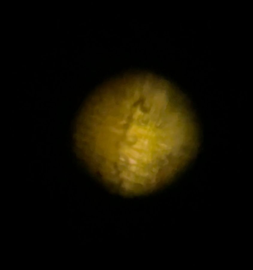 I also took a blade of grass to examine. When I looked through the foldscope, I could see the texture of the grass up close. I could see distinct lines running through the grass and much of the texture looked like little hatch marks. I could see the beautiful green color of the cells quite vividly, no doubt a result of the chlorophyll of the plant cells. It is difficult to tell from this blurry photo, but I could see the light through the blade of grass, meaning the blade wasn’t completely opaque. I wondered what the purpose of that was, and I contrasted it with the leaves of plants like desert agaves, whose leaves are covered in a thick waxy cuticle and are extremely opaque. Does this extra transparency of the grass help with light or some other type of resource absorption? Perhaps the transparency isn’t necessarily an advantage but is just a byproduct of the grass being thinner (and perhaps it is thinner because it allocated less resources to this sort of growth)? Many questions to ask for this one, but interesting to explore nonetheless!