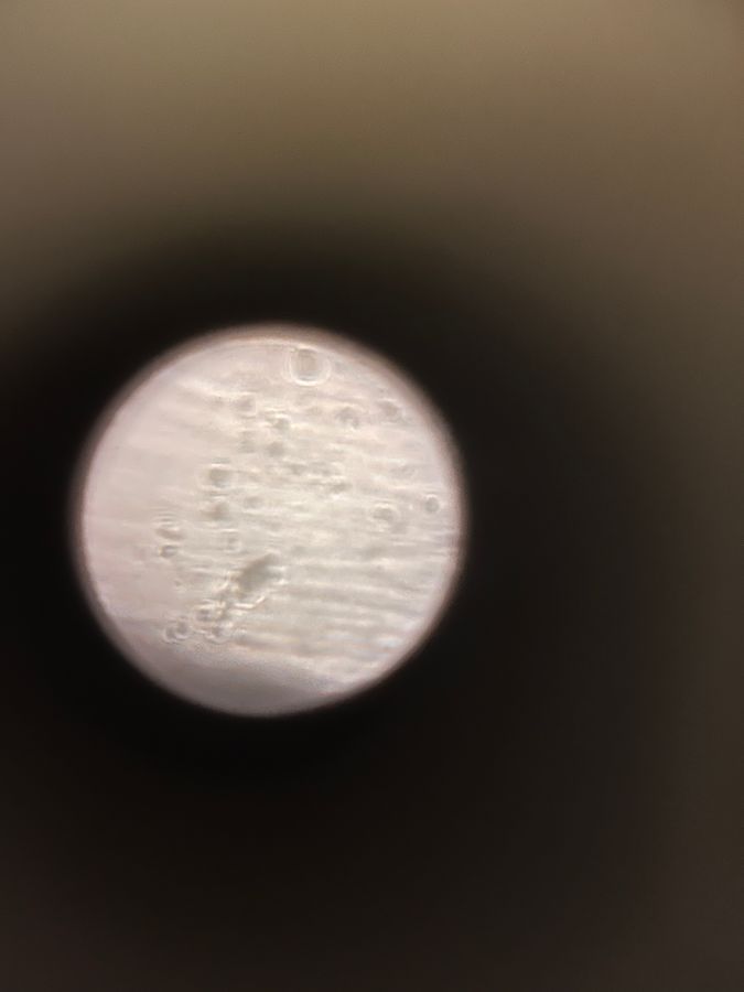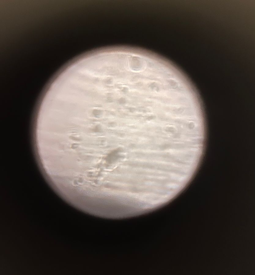 It was a very rainy day, so the first thing I was curious in testing was some water. I did this by going outside and holding my slide underneath a trickling branch. Under the microscope, it was a little difficult to see. As you can tell from the picture, I saw some round orbs of varying shapes and sizes. I thought that perhaps these were some various microbes in the water droplet. There are microbes that look very different, so I wondered if these were different species of microbes. This prompted me to think about interspecific competition amongst the microbes. Was it their different sizes that allowed them to fill different niches and that allowed them to both coexist? Do their different sizes correlate with different life histories for the microbes? Are they similar or same species of microbes but in different life stages?