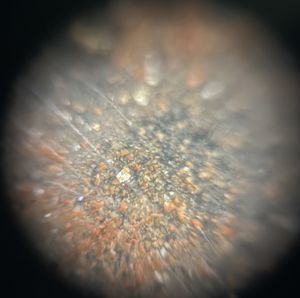 The clay layer was composed of tiny reddish clay particles. Under the reflective lighting the particles look like tiny rocks. The first image was taken with a Foldscope 2.0 using a 50X magnification lens with reflective lighting. The second image was taken with a Foldscope 2.0 using a 140X magnification lens plus 5X zoom. There are a few larger particles mixed in, but the tiny clay particles fill in most of the space between the larger sandy particles.
