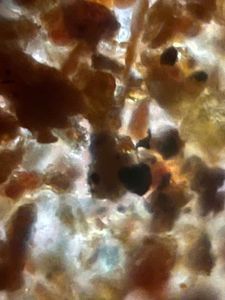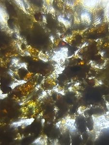 The top layer contained large particles that appeared to be fuzzy around the edges. There were also crystalline particles (probably sand) that were clear and yellow. This image was taken with a Foldscope 2.0 using a 140X magnification lens plus 5X digital zoom.