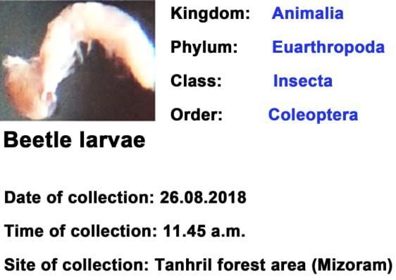 Beetle larvae was seen and identified by using foldscope in soil samples collected from Tanhril forest area, Mizoram and also taxonomy of beetle was given.Scarabs are stout-bodied beetles, many with bright metallic colours, measuring between 1.5 and 160 mm. They have distinctive, clubbed antennae composed of plates called lamellae that can be compressed into a ball or fanned out like leaves to sense odours. The front legs of many species are broad and adapted for digging. In some groups males (and sometimes females) have prominent horns on the head and/or pronotum to fight over mates or resources