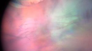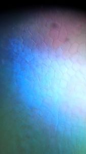 I studied gems with the Foldscope and found it to be a pretty awesome portable tool. Couple of issues: using hard gemstones with pointed culets, I happened to scratch the lo-mag lens. Switched to hi-mag and tried to be more careful, but that’s definitely a concern. I had some tiny gems glued to slides to study, and some loose, which I held in the gap with gem tweezers. Hard to hold a stone, move the image around, and focus at the same time, but I did manage to get some great shots. Here’s how slides were prepared. The first photo shows natural opal (with some crazing – natural internal crackling) at low magnification. Second photo shows synthetic opal taken at high magnification, with characteristic “snakeskin” pattern that proves it is synthetic.