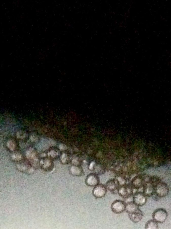Studying pollen using folding microscope has become a fascination with my daughters. Pollen from a flower was dusted on a slide and observed under a foldscope. Gleaming, smooth -walled pollen were visible.