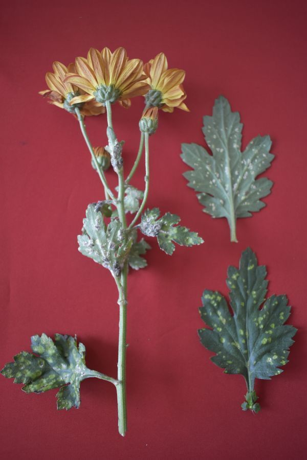 Beauty of chrysanthemum as spoiled by the white rust disease on the leaves.