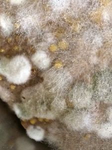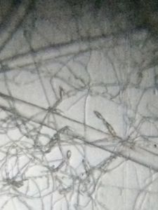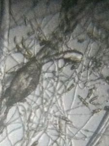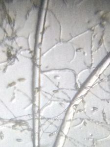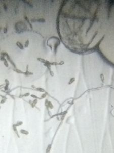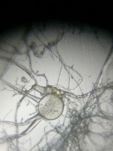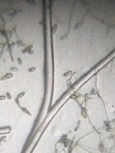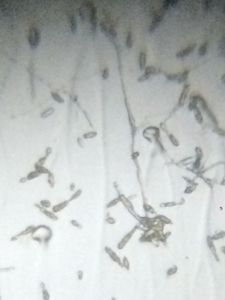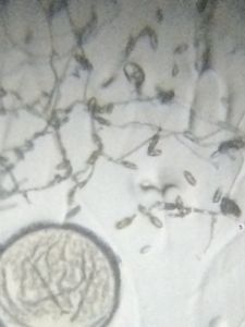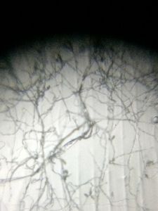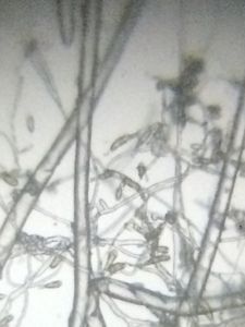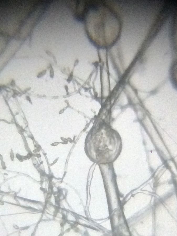 My winter vacations began with fungal rich samples for my foldscope. Travelling from Chandigarh to Ahmedabad (in Gujarat) to my daughter’s place proved to be an enthusiastic vacation for me. While she was off to her workplace, I was busy cleaning the mess and there I got samples worth to view under a foldscope. In a corner of the kitchen lay a bowl of fermented dough with fungal growth on it. On the grey-black velvety mat I could see some pure white cottony colonies. I took a slide and fixed a little sample to see through my foldscope. A neat, woven, intricate network of hyphae could be seen. I tried hard to locate spores or sporangia, but very tiny structures could be seen.