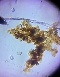 Day 14 – The Colpoda are back! Finally after ten days I observed the material, which was again drying out. I squeezed it and collected the water drops. Interestingly, the Colpoda were still alive. Quite a few were enmeshed in the decomposing dagad phool , in resting stages, in which they move around in tight circles. This movement is an identifying characteristic of Colpoda .