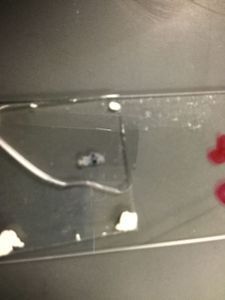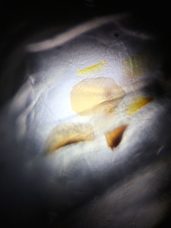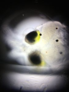 In December, Tom got several larval squid from the Hopkins marine station. (shoutout to dianateuthis!) They were only about a millimeter or two in length but fairly active, so we decided to image them using the Foldscope. We also wanted to try out a new imaging station I’ve been working on to pair with the Foldscope for thicker samples like this one. Tom prepared a glass slide with a cover slip held up with four small balls of clay. We placed the squid in a drop of water between the cover slip and the glass slide. The height was enough to keep it ever so slightly pinned, but definitely not squished.