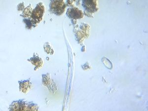 A nematode, presumably from Rhabditidae family because of the tail? The oval shaped bubble next to it’s head could also be some organism, but the resolution isn’t good enough to identify.