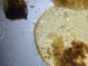 Not sure if this is an egg of a mite that has already hatched? Next to it is a fungal hyphae and something I can’t identify 🙂