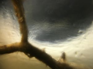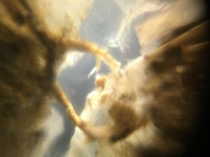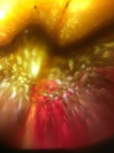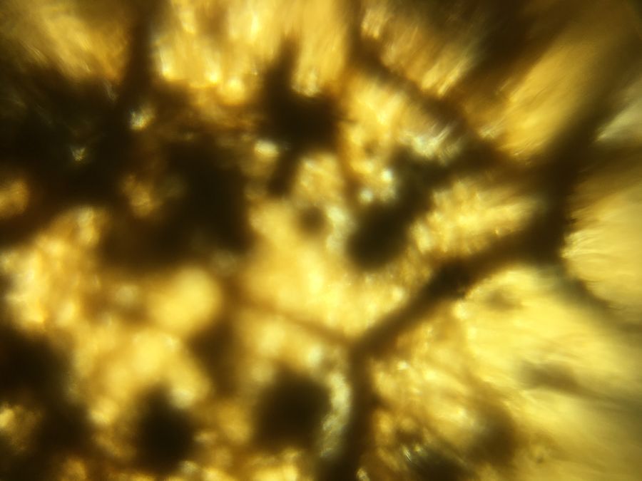 A healthy ivy leaf under the Foldscope. Stem of healthy ivy leaf under the Foldscope. Then, we observed a small yellow spot surrounded by a red ring on one of the ivy leaves that we collected and decided to do a bit of research. According to the Missouri Botanical Garden Ivy, which is of the genus Hedera , can develop what they refer to as a “bacterial leaf spot,” which is what we believe that we saw on the leaf. According to the Missouri Botanical Garden, these spots appear as a result of excess water pooled on the leaves of the ivy.