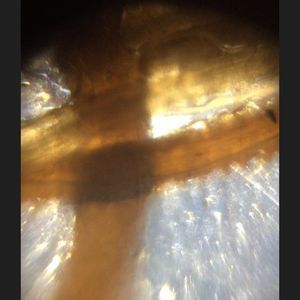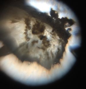 Aha! Dirt! I though. Something to study. Digging around, I saw patches of sandier beige soil and other areas of dark brown soil. I started to wonder if this soil was similar to most soils on campus, or had less clay than areas near the river. This spurred more ecological questions, about how soil types would affect what types of organisms that could survive in the area, the amount of water that was retained in the soil, and how the constant mowing of the field affected the species that could survive in the area. I proceeded to put the dirt under the foldscope and took a look.