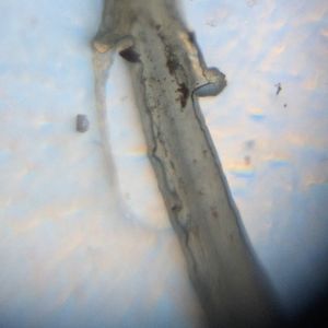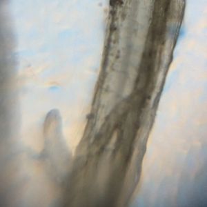 First I looked at the long, thing white root (from the unknown plant). The main section of the root was too large to clearly focus on, but I was able to see the smaller branching of the root. The root appeared to have long tube like shadows passing down their centers (as seen in the first and last image). Perhaps these are for transporting water to the leaf of the plant. Another interesting observation is that the end of the root is rounded in this plant (last image), while in the grass root system there is a flat edge to the root head (last image of second series).