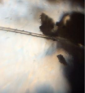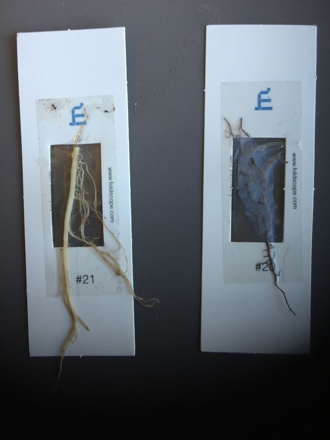 Since these two specimens, (as seen above), had such a different looking root systems, I decided that these were going to be the focus of my next foldscope investigation. I selected one piece of root from the unknown specimen and one from the grass.