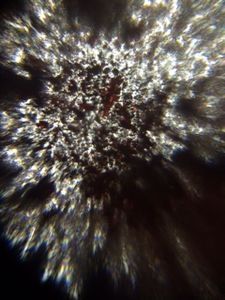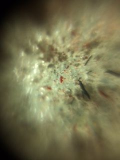 These two photos are of soft grade red and black charcoal mixed in a single slide. I wanted to see why my red charcoal never flows like the black stuff despite being the same grade and although I tried I can’t really see much difference between the two despite placing them together . I suppose the microscopic nature of red charcoal’s stubborn flow remains an art mystery for me! But I guess I can accept it since the way the light passed through it all still looks pretty!