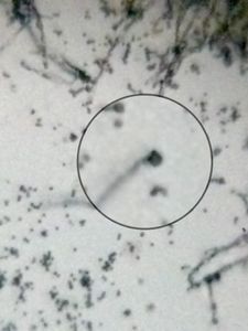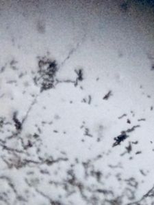 Sample -5 is of fungal growth on Pumpkin. White crust was seen on pumpkin stored in refrigerator. A sample was drawn and observed under foldscope to study the type of fungi. Extensive hyphae with branched conidiophores and conidia in chains was observed.