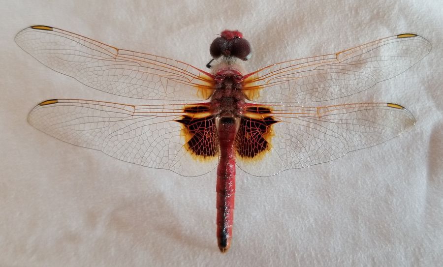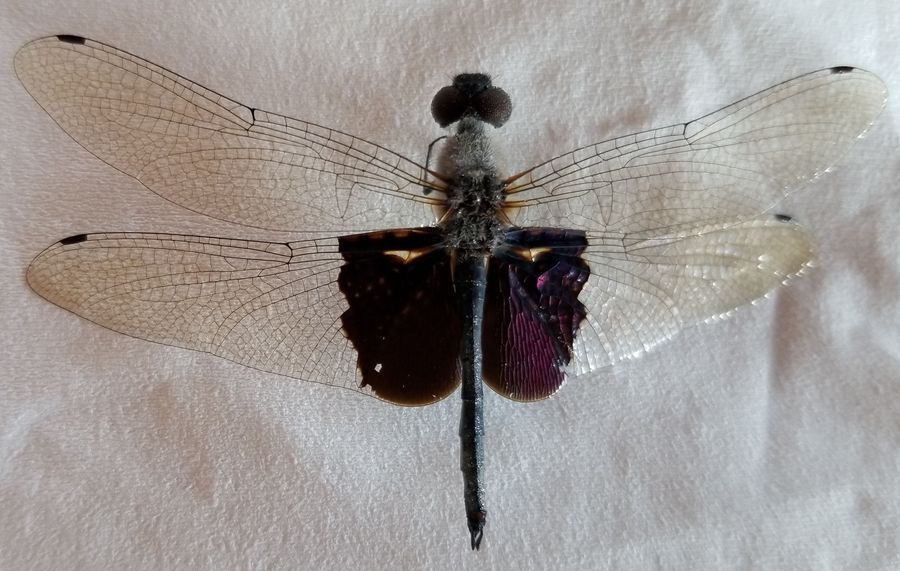 Possibly a Phantom Flutterer ( Rhyothemis semihyalina ) I was really intrigued by the architecture of the front and back edges of the wings. I assume these microscopic bristle-like structures play a role in the ability of these creatures to hover in place in the air.