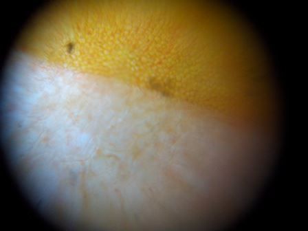 தோல் ஒட்டிய பகுதி காலையில் இதை பதிவு செய்தேன். அம்மா சமைப்பதற்காக தக்காளிப் பழம் எடுத்து அறுத்துக்கொண்டிருந்தாங்க. நான் அதன் குறுக்கு வெட்டு தோற்றம் எப்படி இருக்கும் என்பதை பார்ப்பதற்காக ஒரு பிளேட் ஆல் வெட்டி எடுத்து கண்ணாடி சிலேட்டில் வைத்துப்ப பார்த்தேன். அதன் உள்ளே அற்புதமான நீர் திவளைகள் போல பார்த்தேன். பனித்துளிகள் அருகே அருகே ஒட்டியிருப்பது போல இருந்தது. தோல் பகுதியில் ஆரஞ்ச் நிறத்தில் குருணை குருணையாக தெரிந்தது. பார்ப்பதற்கே அழகாக இருந்தது. அப்படியே பள்ளிக்கு எடுத்துச் சென்று என் நண்பர்களுக்கு காட்டி ஆச்சரியப்படுத்தினேன்.