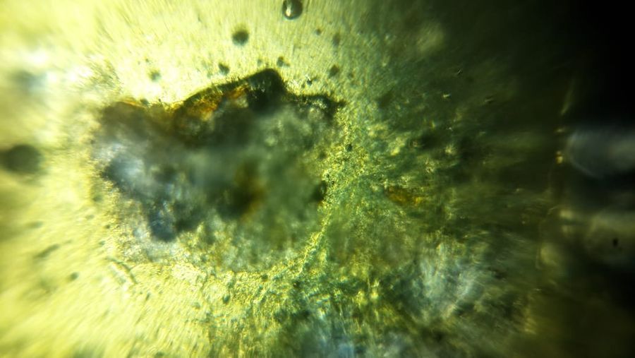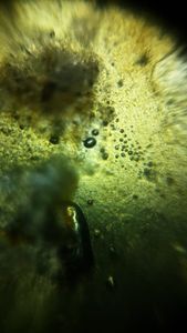 To my surprise, when I looked at the sample, it looked green, not magenta! The fact that green is the complementary color of magenta probably has something to do with this. Perhaps the raisin absorbs wavelengths of light associated with green, so when viewed normally, we see its complementary color, while when viewed with the foldscope, only light that can be absorbed and re-emitted on the other side can be seen. There were also a lot of circular shapes that appeared to be bubbles. Maybe these are pockets of air that were trapped when the sample was pressed against the plate. Reading online about raisins, I learned that it is possible for the sugars to crystallize, so perhaps some of the large shapes are sugar crystals. It would be interesting to compare these images to ones taken from grapes, to see if or how they differ.